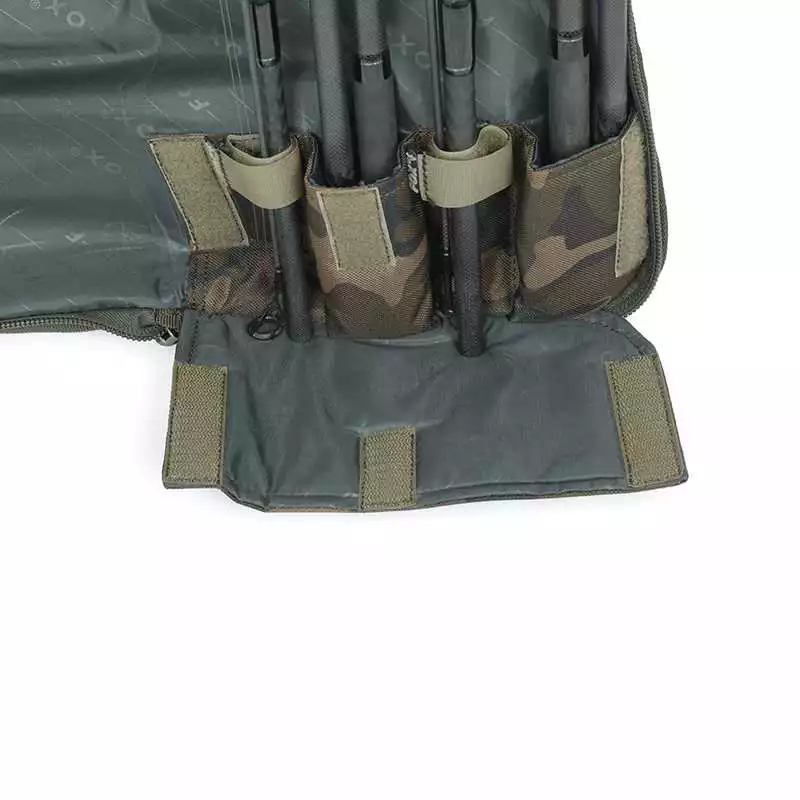 Durch sein einzigartiges Design wird der schon üppige Platz noch weiter optimiert. In dieses Rod Case bekommst du locker deine Ruten sicher verstaut sogar mit großen weitwurfrollen wie z.B. der FX13. Es ist so konzipiert, dass du deine Ruten entweder mit den Ringen oder der Rolle nach unten einsetzen kannst. Die Rutenenden sowie auch die Rutenspitzen werden durch die gepolsterten Aufnahmetaschen an beiden Enden gut geschützt und die Spitzenringe können mit Klettverschlüssen fixiert werden. Alle wichtigen Bereiche deiner Rollen und Ruten sind extra mit verstärkten PU-Einsätzen ausgestattet.